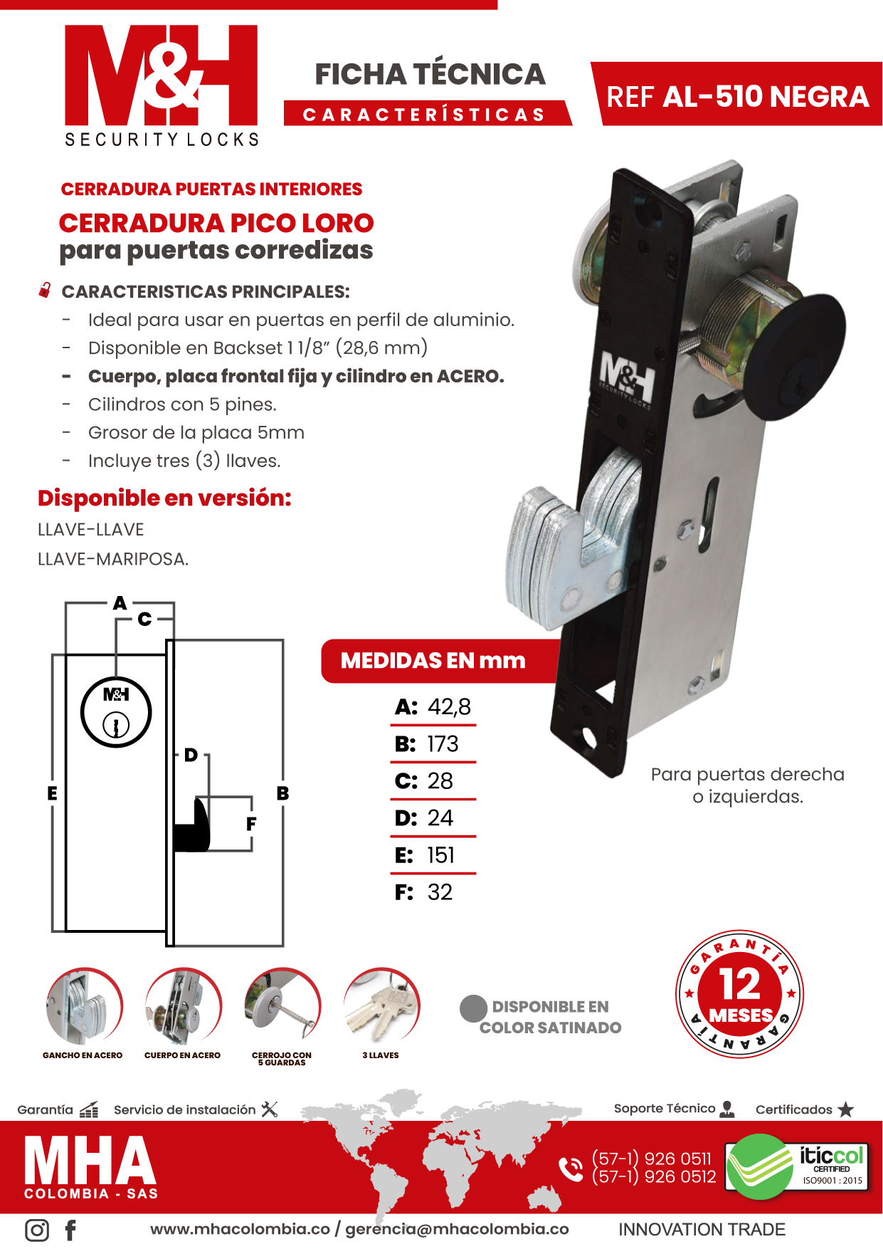 CERRADURA PICO LORO PARA PUERTA CORREDIZA CON GANCHO: mecanismo de embutir para puertas corredizas, ideal de aluminio; cuerpo, placa frontal fija y cuerpo en acero; cilindro con 5 pines, con tres (3) llaves. Funcion llave llave. Acabado: NEGRO MATE